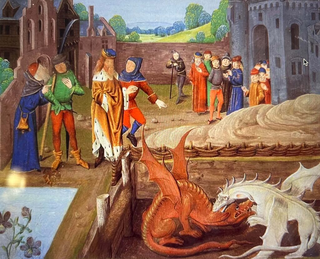 In Portuguese mythology, Coca, a female dragon, fights with St. George, later patron saint of England, Portugal, Germany, Lithuania, Georgia, Russia and Palestine, and of the Order of the Garter. The dragon loses strength when St. George cuts off one of her ears, and in Book 11 of Idylls of the King, Guinevere, The Dragon of the Great Pendragonship appears on King Arthur’s Shield and Crest. Indeed, the best- known dragon augury was the vision of two dragons that appeared in a dream of Arthur’s father, Uthur, foretelling Arthur’s rise to the Round Table. Prior to this, Merlin prophesizes Britain’s history beginning with Vortigern’s rule and the succession of Uther Pendragon, so named after he saw a comet in the shape of a dragon when marching to war. Arthur’s basically peaceful reign follows but then, Geoffrey of Worcester’s time, replete with dragons, brings chaos for Britain in the following years, as the Red Dragon, foretold by Merlin, tears itself apart. Whereas the Welsh Red dragon may be inspired by the Roman draconarius cavalry who dominated Britain from 1350 CE, the Welsh white dragon, Y Draig Wen, is associated with the Anglo-Saxons. Whereas the white dragon is Vortigorn, the white dragon is Satan. Both are depicted in battle in Geoffrey of Monmouth’s History of the Kings of Britain where the white dragon is denoted as English as shown in the accompanying image. In a society where most, excepting those in the church, were illiterate, visual art conveyed the battles of good against evil, Christian against dragon.