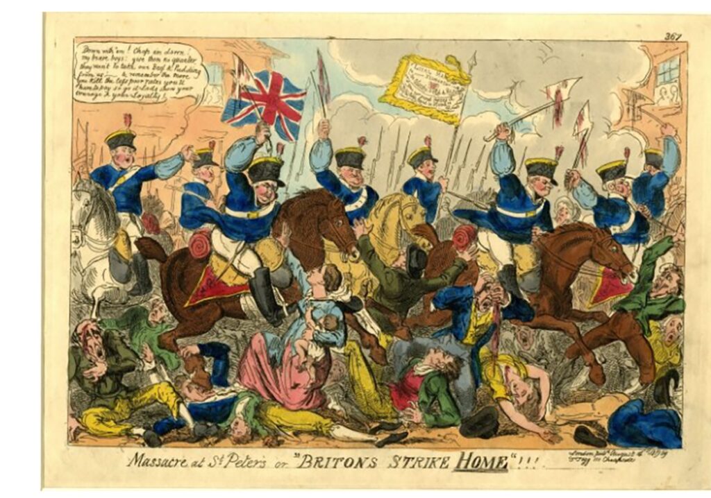 The militia charged into the crowd on horseback, wielding sabers and causing chaos. Over fifteen people were killed, including a toddler and the pregnant protester. Hundreds more were injured. The incident became known as “Peterloo” in ironic reference to the Battle of Waterloo (1815), at which Britain had defeated Napoleon. At Peterloo, the government defeated the people - that is, Britain.