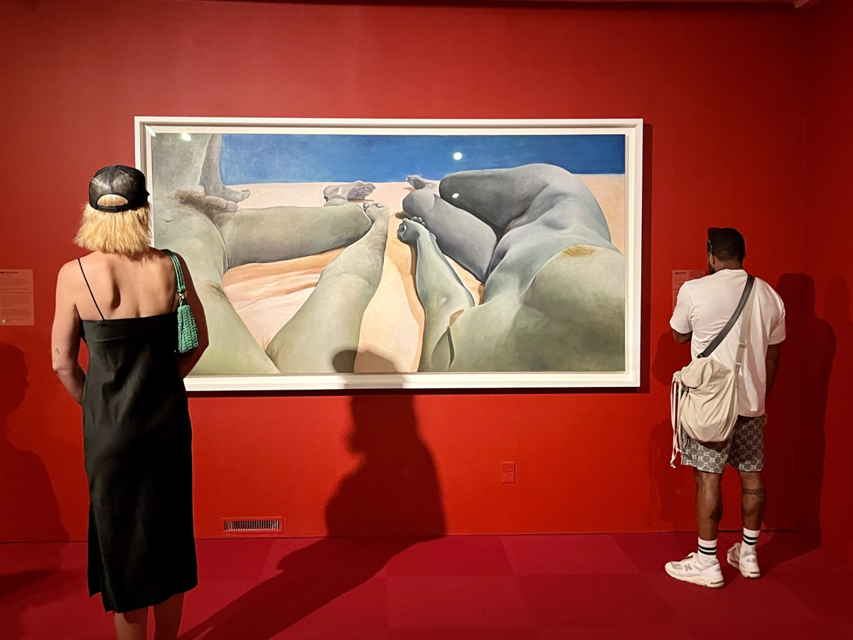 Above the entrance to the first room is Cecily Brown’s Triumph of the Vanities II (2018), in which she said ‘painting is very good at saying more than one thing at once,’ which could very well be a way of saying her work is contemporary Cubism. As an entry point to the exhibition, it’s easily a many things are going to be said past this door, with many bodies involved. Picasso is not the first thing, but off-step from across the doorway. First is a Linda Nochlin quote: “In a world of total and unconscious equality, the female nude would not be problematic. In our world, it is.” Beneath it are the Guerilla Girls, with their own odalisque mock and real statistic, of ‘Do women have to be naked to get into the Met Museum?’ (1985). Faith Ringgold’s Jo Baker’s Birthday (1995) follows, paying homage to Matisse’s work and patterns. There’s a small figurative piece by Judy Chicago, with bodies tangled like an island. More Guerilla Girls text pieces about the massive inequalities women artists faced. They overtake a red papered wall recalling an early Nochlin performance and the massive ‘Portrait of Linda Nochlin and Richard Pommer’ as a seated couple (1986) by Phillip Pearlstein. Hung on wallpaper made of Nochlin’s Buy My Bananas (1972), the portrait satirized Achetez des Pommes, a 19th century photograph of a woman holding a tray of apples beneath her breasts and a nude man holding a tray of bananas beneath his genitals. Who is the sexualized object, after all?
