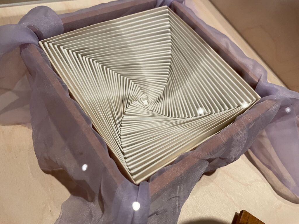 Saito’s game-like cubes also had parallels in Mieko Shiomi’s Fluxus Balance (1993), her 1963 compilation Events & Games of 21 offset cards, produced first in wooden and, later, plastic boxes by Maciunas and finally important works completed after she left New York in 1965 with only four seen to their fruition by Maciunas, her nine Spatial Poems. The nine Spatial Poems, all seen here in some form were No.1 Word Event (1965); No. 2 Direction Event (1965); No. 3 Falling Event (1966); No. 4 Shadow Event (1972); No. 5 Open Event (1972); No. 6 Orbit Event (1973); No. 7 Sound Event (1974); No. 8 Wind Event (1974) and No. 9 Disappearing Event (1975).