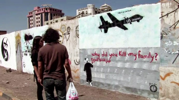 As Codswallop and Banksy show us, not much can be stronger than a message of protest given through art. This example of graffiti art follows the tradition of Banksy, showing all too clearly the results of the drone strikes in Yemen, where over one third of the deaths caused by US drones this year were civilians.