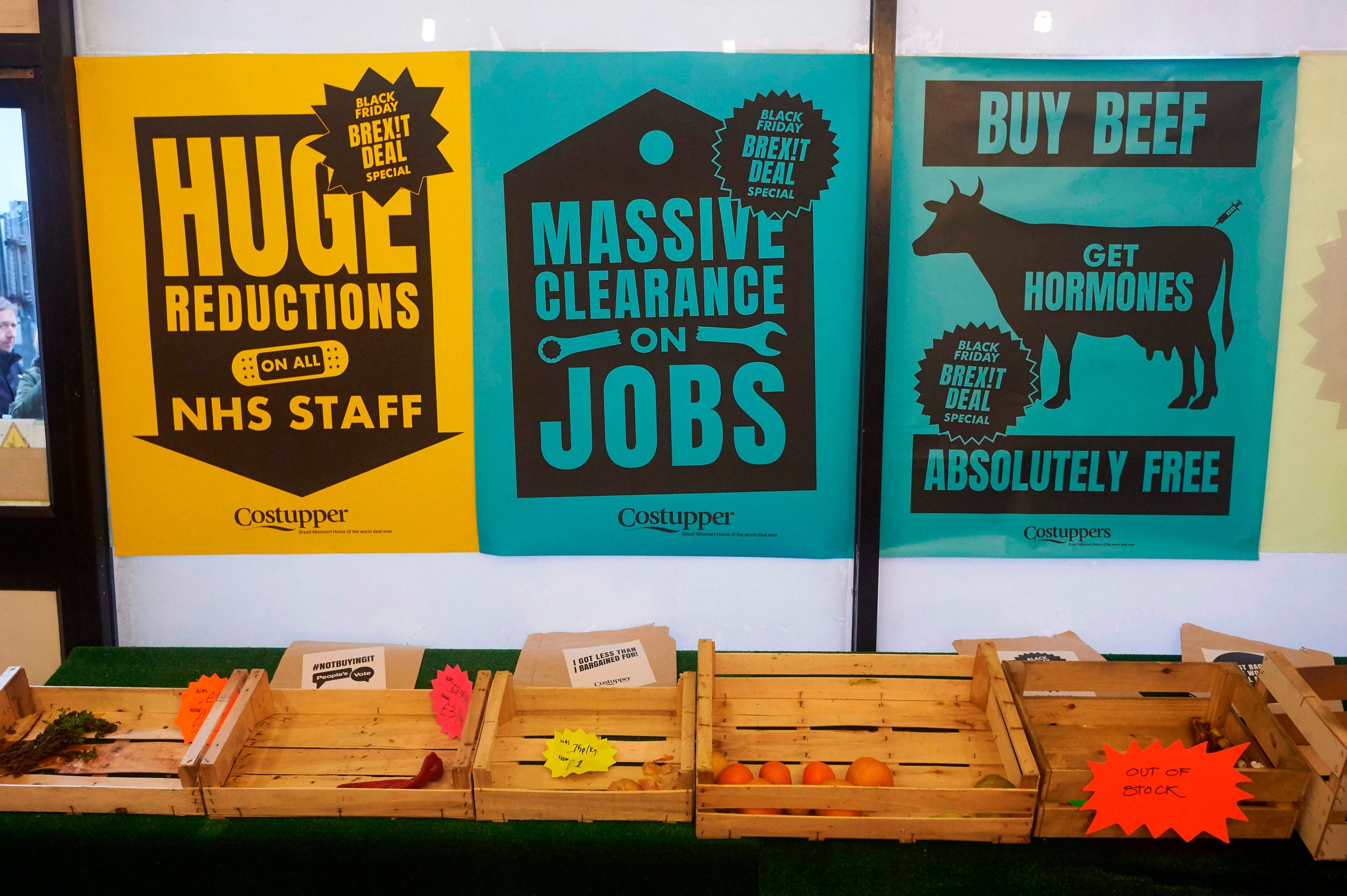 A Brexit minimart exhibition has opened in London under the name of Costupper. It has on display tired flowers, a couple of oranges in an empty crate, butter labelled with “I Can’t Believe the Price of this Butter”, “Conman’s Mustard”, “Tomato Botchup” and other items parodying how the shops will be after Brexit. Unfortunately, this highly creative exhibition closed yesterday after only 2 days.