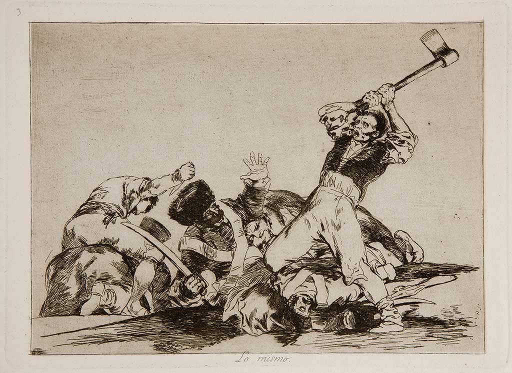 Plate 3: Lo mismo (The same). A Spanish civilian about to decapitate a French soldier with an axe.
